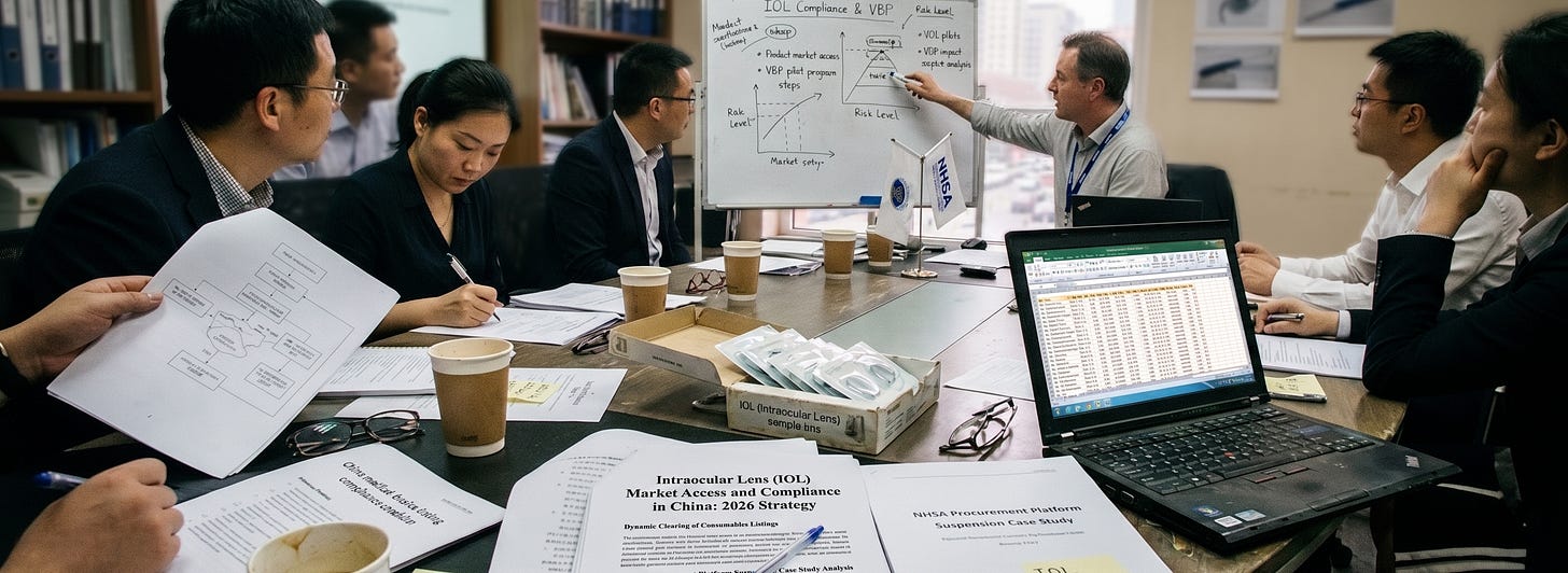 China’s medical device listing system shifted in 2025–2026 from passive registration to active compliance maintenance. Manufacturers affected are all entities with products on provincial procurement platforms, both foreign and domestic, but the practical burden falls heaviest on those without dedicated market access monitoring. For IOL manufacturers specifically, the listing-suspension risk is not indirect: a suspended product disappears from the hospital procurement channel regardless of whether the end patient is paying out of pocket. The immediate action is a platform audit of active listing status, price-linkage compliance, and product classification accuracy across key provinces, prioritising Zhejiang and Guangdong, given their demonstrated enforcement activity in April 2026.