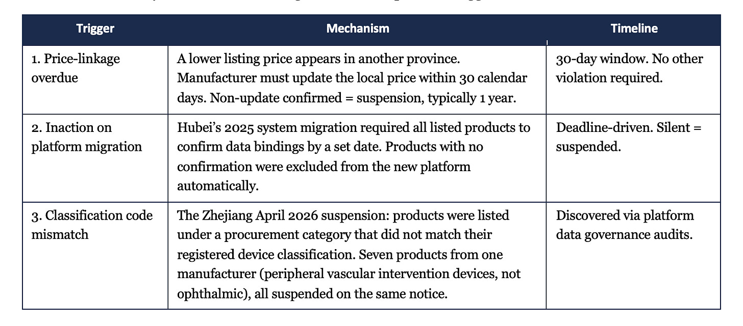 The Zhejiang April 2026 suspension: products were listed under a procurement category that did not match their registered device classification. Seven products from one manufacturer (peripheral vascular intervention devices, not ophthalmic), all suspended on the same notice.